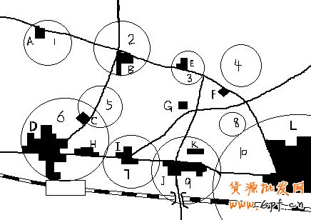 b、一塊陰影不一定只有一個零售商店,也可以表示整個商業區,陰影面積表示零售設施規模的大??;
