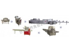 該生產線由熬糖設備、攪拌機、送料機、鋪料機、拍打機、撒布機、冷卻流泵、自動切塊機、巧克力涂層生產線、包裝機組成,整機采用變頻調速同步,PLC控制切塊長度,七道輥筒壓平,微電腦控制成型溫度,成型方正良好,切塊長度精確,產品重量一致,整機連續生產,實現了對谷物棒真正全自動智能化作業。