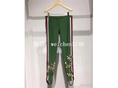 2017秋冬新款歐美高端女裝綠色花卉刺繡踩腳緊身褲長褲