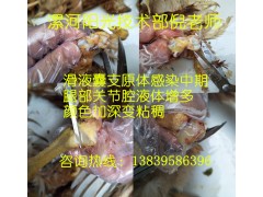 雞胸部龍骨上有膿性分泌物(透明色、黃顏色增生),腿關(guān)節(jié)、腳墊腫脹,有明顯鼓起,剪開可見黃顏色膿性分泌物。感染滑液囊支原體的雞隨著病情的發(fā)展,龍骨上的膿性分泌物增厚增大形成塊狀干酪物,腿關(guān)節(jié)腔的液體由早期的少量透明色發(fā)展為粘稠的黃顏色液體、橘紅色干酪物。