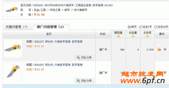 賣家在推廣中,利用最廣泛的就是直通車,而針對(duì)直通車推廣的產(chǎn)品,可以做兩個(gè)推廣內(nèi)容管理。比如可以放兩張不同的圖片,然后針對(duì)該產(chǎn)品的大流量關(guān)鍵詞出適當(dāng)?shù)母邇r(jià),讓這個(gè)產(chǎn)品在流量大的詞匯搜索中有一個(gè)好的展現(xiàn)位置,接著連續(xù)觀察兩天左右的時(shí)間,就可以判斷出圖片的優(yōu)劣。如果圖片的點(diǎn)擊都不盡人意,那么可以做新的主圖再做對(duì)比分析。