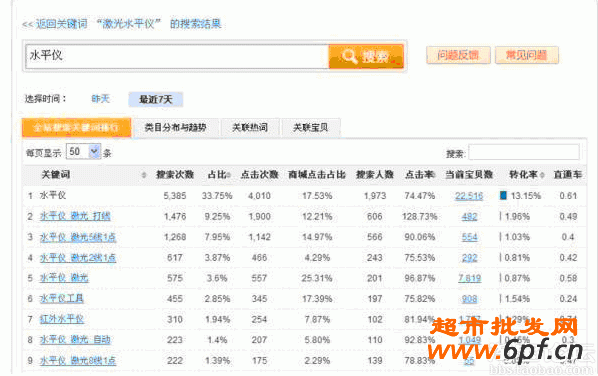 關(guān)鍵詞的匹配中,“水平儀 激光5線1點(diǎn)”、“ 水平儀 激光2線1點(diǎn)”兩個(gè)關(guān)鍵詞都匹配這個(gè)寶貝的屬性,對(duì)比分析在關(guān)鍵詞搜索上“5線1點(diǎn)”的搜索量和搜索人數(shù)上同比“2線1點(diǎn)”高出一倍左右,在轉(zhuǎn)化率上也高出0.2%,那么有限的字?jǐn)?shù)里面設(shè)置“5線1點(diǎn)”這個(gè)詞含金量肯定比“2線1點(diǎn)”這個(gè)高。繼續(xù)觀察其他指標(biāo),發(fā)現(xiàn)“水平儀 激光 打線”這個(gè)詞當(dāng)前淘寶上架的同類寶貝數(shù)只有484件,轉(zhuǎn)化率也有1.96%,也就是說(shuō)搜索量更大,但是競(jìng)爭(zhēng)對(duì)手相對(duì)又少,那么這個(gè)詞的價(jià)值肯定很高,趕緊用上。其他關(guān)鍵詞也利用同樣的辦法依次類推,值得注意的是關(guān)鍵詞搜索時(shí),最好選擇最近7天這個(gè)時(shí)間選項(xiàng),只觀察昨天這個(gè)數(shù)據(jù)誤差偏大。