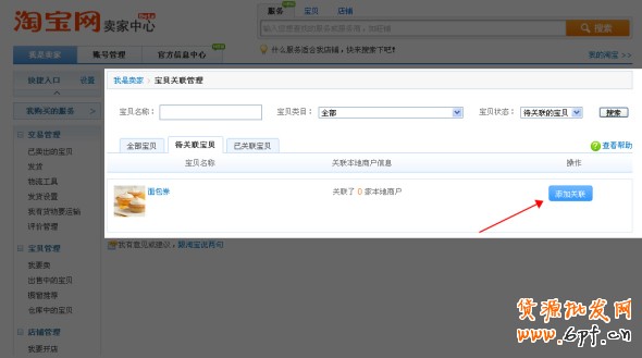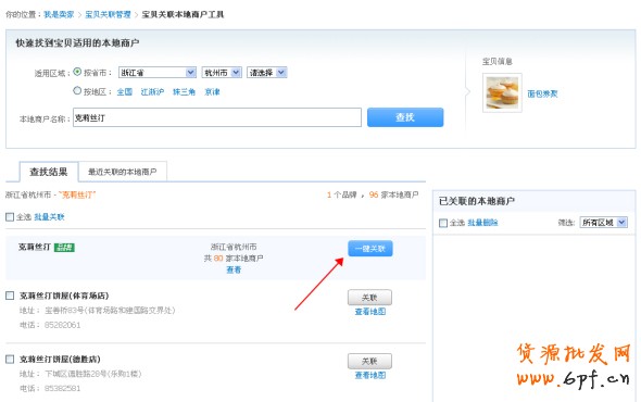 5、在查找的結(jié)果中,我們選擇該寶貝可以消費(fèi)的商戶,按“添加關(guān)聯(lián)”,那么該本地商戶就和該寶貝完成了關(guān)聯(lián)。如下圖所示