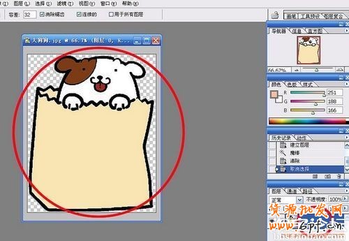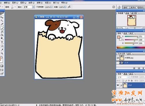 2.雙擊背景圖層的小鎖.然后就變成了圖層0,這個時候我們需要把狗狗白色背景扣掉.用魔術棒吧,對著白色背景點一下,然后按下鍵盤上的Delete,就干凈了.(注意:這個方法只適合簡單的扣背景哦,復雜了,還是選擇鋼筆吧,我覺得比較干凈.魔術棒的圖就不貼了吧,如果有不懂的,跟貼問我吧,我會很快回答您的.)!