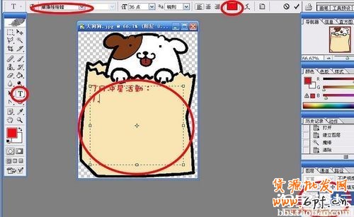 3.按下鍵盤上的T(或則在PS上找到T)矽矽已經用紅色小圈圈出來了.在想要寫上公告的地方寫上自己想寫的字.比如什么折扣方法呀,活動細節之類的,不過注意別太多了.最上面的一欄兩個紅圈是可以改變字體的,和顏色的,字體是矽矽自己下的(PS自帶的,太難看了..這里就不多介紹下字體的方法了),最下面那個小紅圈出現了T,就是字體圖層.