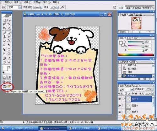 7.現在我們要用到ImageReady,在圖上畫紅圈的地方點一下,有的是英文的,有的是中文,矽矽用的中文的,英文的地方也和中文一樣,以前我也用過英文的.