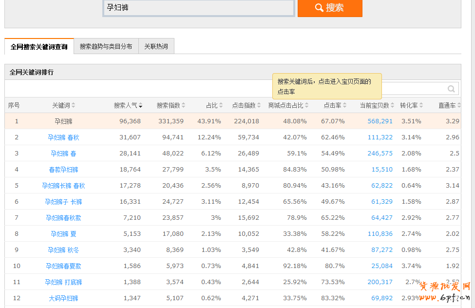 我們來看看通過魔方搜出來的孕婦褲下面幾個流量比較大的詞,在淘寶里面的排名