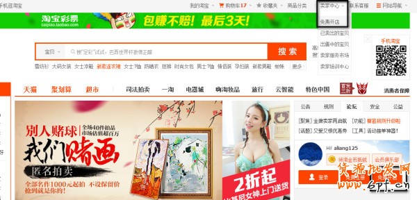 1、淘寶網(wǎng)首頁吊頂?shù)馁u家中心或免費開店