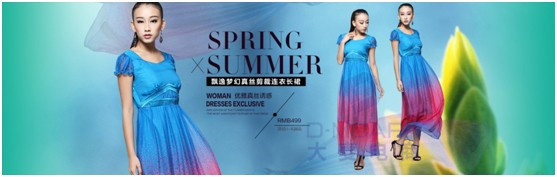 藍色是2014潮流色系。藍色代表著一切萬物的純凈,也有著冷靜、理智與美麗,具有強烈的春夏季節性特點。從產品本身來看,這條長裙屬于春夏款,且產品主色調是藍色;春夏的代表顏色,首先讓人聯想到的也是藍色和綠色,因此確定海報主色調為藍色,局部過渡綠色。讓調性更為生動。
