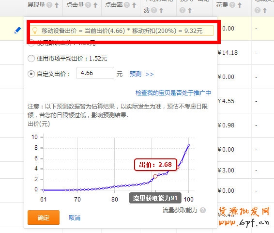 流量獲取能力是排名的弱化版,獲取能力從0-100。60以上就開始進入排名前一百了,獲取能力越高,排名越高,但是在直通車個性化展示的不斷強化過程中,流量預估功能的出現開始改變人們對直通車卡位的依賴。我們會發現,之前精細化的直通車操作,現在越來越模糊,很多人感覺越來越難做,因為不知道現在的排位了,這里給大家放一個公式:100-(排名/2.5)=流量獲取能力,大家可以通過這個公式大概判斷自己的位置。