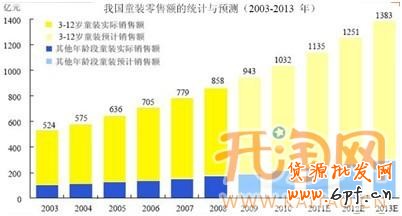 近幾年,的小編發(fā)現(xiàn)我國童裝市場保持穩(wěn)步增長,2010年零售額為1032億元,預計到2013年將達1383億元。其中3~12 歲的童裝占據(jù)整個市場零售額的80%以上,預計至2013 年,市場規(guī)模將突破1000 億元,達到1085 億元。