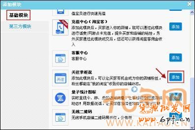在彈出的“添加模塊”對話框中的基礎模塊部分,單擊“關注掌柜說”右側的“添加”按鈕,如圖5-19所示。