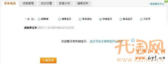這里的店鋪動態(tài),顯示的是我們收藏過的店鋪的動態(tài), 比如說你店鋪里面的收藏用戶,在你發(fā)布店鋪動態(tài)后,就能在這里看到你的店鋪動態(tài)了。好友動態(tài),則是我們的粉絲可見的,就像微博粉絲一樣,二者不沖突。在管理店鋪動態(tài)里面可以發(fā)布店鋪動態(tài),如下: