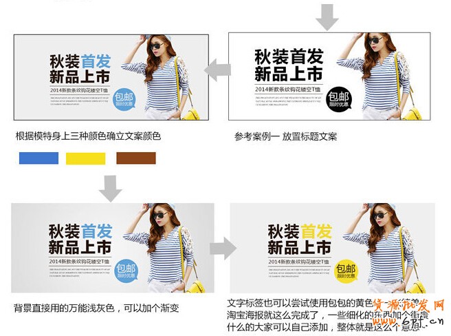 如果我們已經有了產品圖,就可以根據模特顏色來確立背景色和文案顏色。模特都是黃色衣服,推出背景顏色直接用黃色,但是要與產品圖區別開。其次,模特頭發顏色是深棕色,身上褲子和襯衫還有白色成分,所以主標題可以采用棕色,包郵的標簽里用白色文字。主體模特、背景和文案三者的顏色相互呼應,你中有我,我中有你。最后說一點,白色是萬能搭配色。如果沒有合適的就用白色/灰色吧!