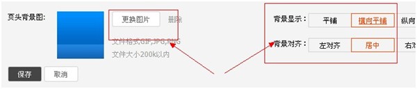 登錄淘寶,通過“賣家中心”--“店鋪裝修”進入淘寶裝修后臺,然后點擊“裝修”--“樣式管理”--“背景設置”進入頁頭背景設置頁面。在頁頭背景選擇上,點擊更換圖片按鈕并將新的頁頭背景上傳,注意背景顯示選擇“橫向平鋪”,背景對齊選擇“居中”。設置完成后點擊保存按鈕。如下圖: