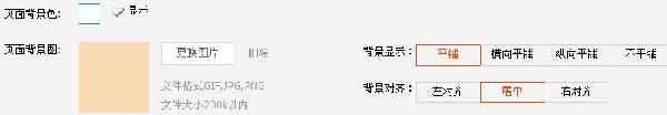 1:首先通過樣式編輯進入背景設置頁面,選擇“頁面設置”,上傳頁面背景素材,注意設置“背景顯示”為平鋪,”背景對齊“為居中。