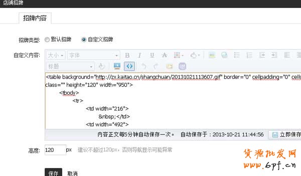 第四步,打開店鋪裝修,點擊店招編輯--自定義區域編輯,將替換鏈接后的代碼復制到自定義代碼格式編輯框中。
