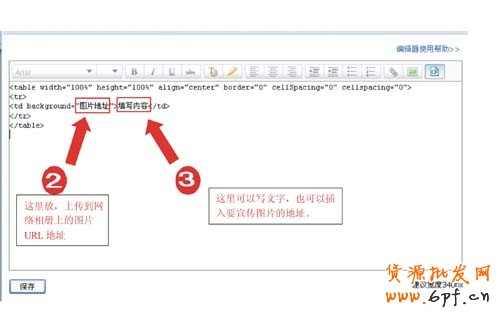 <tr> <td background="圖片地址">填寫內容</td> </tr> </table> ◆ 第一步,打開Æ我的淘寶Æ管理我的店鋪Æ基本設置,在促銷區工具欄中點擊編緝源文件,把圖片背景代碼復制到促銷區中,再把剛剛上傳到網絡相冊的圖片地址復制到下面放圖片地址的地方如圖所示: