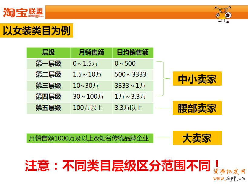 現在我們在上面2張PPT中可以看得到,天貓是把商家分成5各不同層級的。主要以每個月的成交額為維度來劃分。各位先看看,我自己是屬于哪個層級的賣家。但是,值得注意的是,不同類目的考核及劃分范圍是不同的。上面給大家看的是以女裝類目的層級劃分。