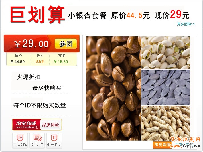 最頂級的就是在寶貝描述里!做一個橫版的,類似聚劃算寶貝展示的框架,幾乎相同,唯一不一樣的是:這個聚劃算團購的頁面是一個套餐,就是橫排兩個或者三個,搭配在一起,幾折,省多少錢,顯示出時間,而且大大的“參團”,兩字,完全模擬聚劃算風格和頁面!!務必讓消費者,知道,你參加聚劃算,不是一個寶貝,而是一個套餐都在做活動!!!