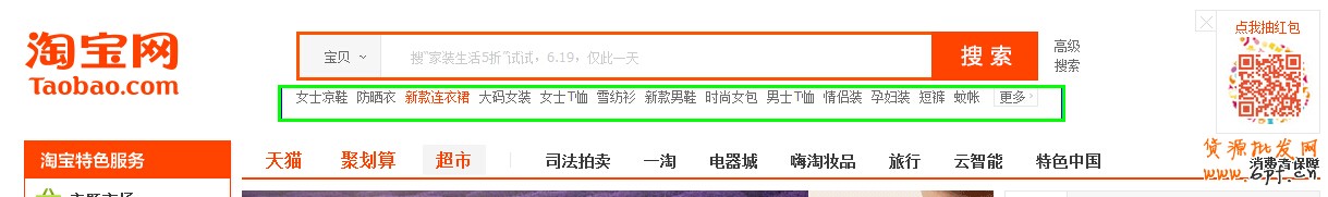 想要知道買家在淘寶網上經常熱搜哪些關鍵詞,我們可以在打開淘寶網,在首頁搜索欄的下面就可以看到時下比較熱門熱搜的關鍵詞。如圖所示: