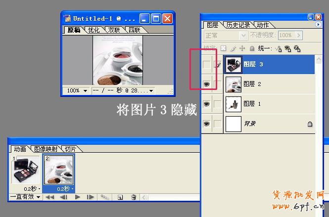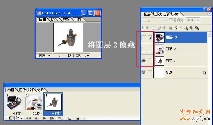 重復第六步,再新建一個禎,再隱藏第二個圖層。這樣,三個動畫,三個圖片,都在動畫工具欄中出現了。如圖