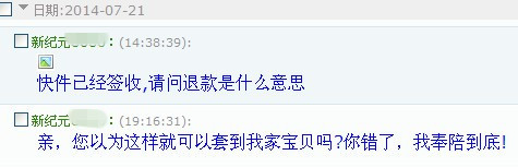 看到寶貝被簽收后,買家卻還是一直在申請全額退款不退貨!買家終于在7月24日出現,卻是以質量問題為由,還是在申請全額退款不退貨!