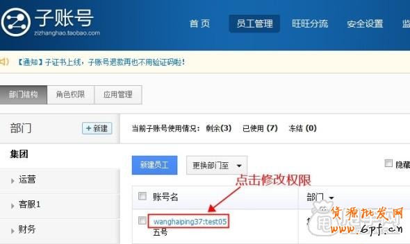 第3.步:進(jìn)入(員工管理--部門結(jié)構(gòu)),點(diǎn)擊子賬號名稱,進(jìn)入授權(quán)頁面: