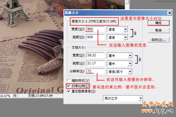 如果圖片寬高比不變,我們就可以直接輸入想改的數值。注意約束比例是要勾選上的,要不圖片會變形。輸入寬度值時你會發現高度值也會改變,像素大小由原來的17.0M也變為1.37M了,小了好多。