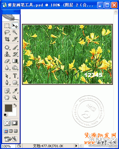 操作的方法與仿制圖章工具相似。按住Alt鍵,在無文字區(qū)域點擊相似的色彩或圖案采樣,然后在文字區(qū)域拖動鼠標復制以復蓋文字。只是修復畫筆工具與修補工具一樣,也具有自動匹配顏色的功能,可根據(jù)需要進行選用。