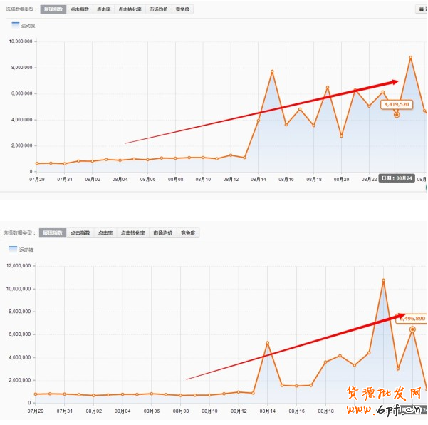 由上圖可以看出:運(yùn)動(dòng)裝、運(yùn)動(dòng)套裝、運(yùn)動(dòng)褲的類目詞流量上升趨勢特別顯,這對于主營類目為運(yùn)動(dòng)戶外的店鋪來說,正是該好好把握的機(jī)會(huì)。