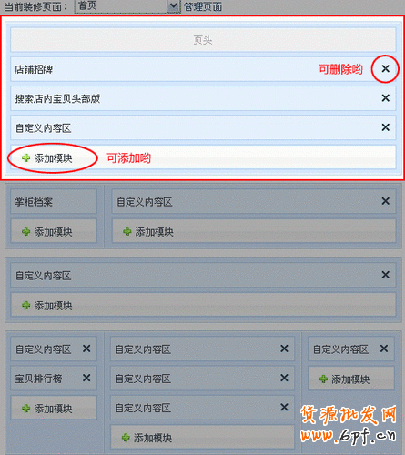 拓展版布局如上圖所示,除了淘寶固定的頁頭不能動以外,其它幾個部分都是可以改動的,包括旺鋪標準版不可改動的店鋪招牌。同時還增加了自定義內容區和搜索店內寶貝頭部版。