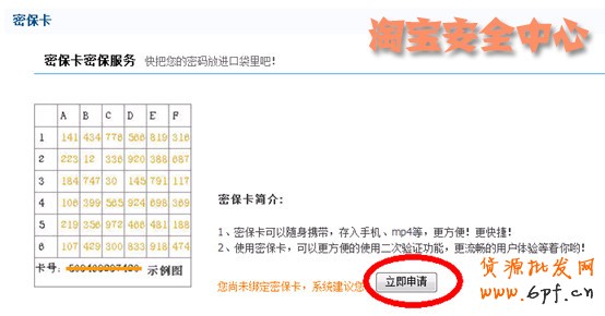 申請流程 1.申請進(jìn)入密保卡頁面:http://member1.taobao.com/member/safe/sec_protect_matrix_apply.htm