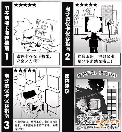 電子密保卡的安全保存方法步驟一:保存電子密保卡圖片到電腦步驟二:保存成其他形式 ( 正確的保存方法見下面漫畫所示) 步驟三:刪除電腦里面的密保卡圖片