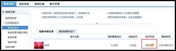 1、在“競(jìng)拍中的寶貝”選項(xiàng)查看進(jìn)行中的拍賣(mài)商品您的出價(jià)狀態(tài)。