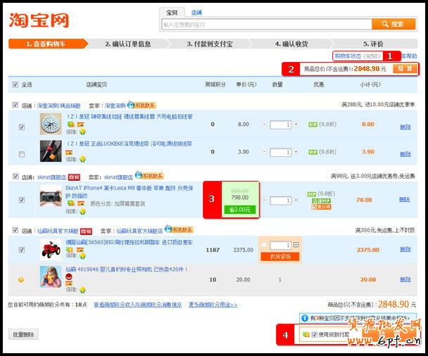 1、右上角的“購物車狀態”——最多能存放50件寶貝哦,隨時看到購物車的使用狀態,幫助你更好的管理購物車訂單!