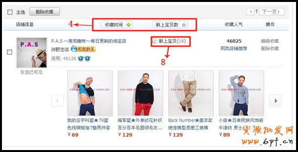 4、排序方式:在寶貝收藏頁面中可按收藏時間/價格/剩余時間順序顯示您的收藏;在店鋪收藏頁面中可按收藏時間/新上寶貝數順序顯示您的收藏。