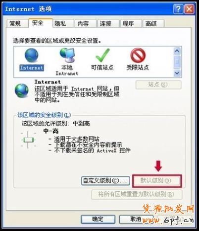 第一步:點擊瀏覽器菜單欄上的“工具”—“Internet選項”—“安全”,選擇internet區域,查看下圖紅框中的“默認級別”按鈕,如果不是灰的,請點擊按鈕,反之,則不做任何操作。