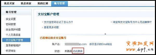 第一步:登錄“我的淘寶”—“賬號管理”—“支付寶賬戶管理”頁面點擊“點此激活”。