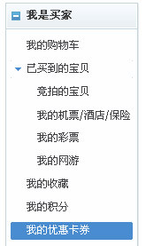 買家進入“我的淘寶”,在右上方有個“我是買家”欄,在這里就可以找到“我的優惠卡券”。點擊它,就可以看到我所持有的店鋪優惠券了。