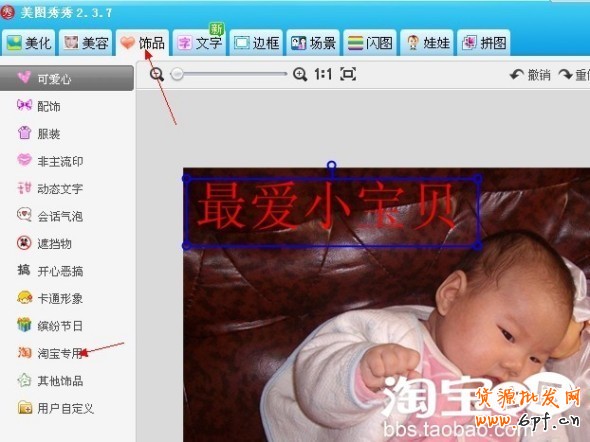 然后親們還可以放一些小飾品上去,美圖秀秀里面有淘寶專用的飾品哦~~這個最適合新手賣家了,哈哈,他們都歸類好了,不用我們費心去找啦~~