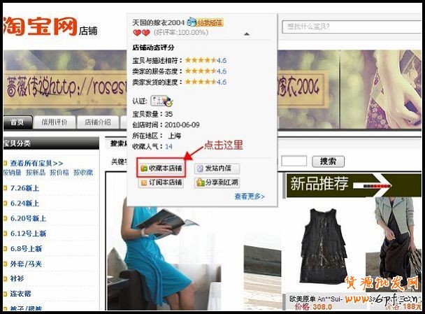您可以點(diǎn)擊任一寶貝頁(yè)面上方淘寶掌柜會(huì)員名處,會(huì)自動(dòng)顯示店鋪檔案,選擇“收藏本店鋪”按鈕收藏賣(mài)家的店: