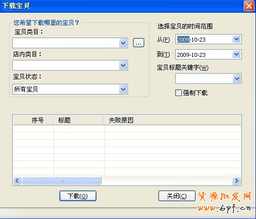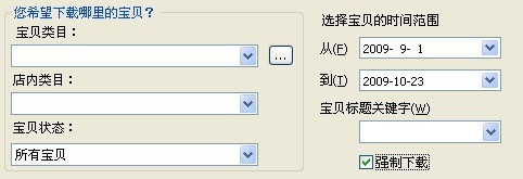 目的是將已經上架到淘寶店鋪的所有寶貝資料下載到淘寶助理中,以便編輯、更改設置。點擊工具欄中的【下載寶貝】按鈕