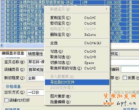 如果要全選列表中的寶貝,可以點擊鼠標右鍵,選擇【全選】,或者用快捷鍵【ctrl+A】選擇好以后,千萬別點擊鼠標了,否則就取消選擇了,這時候點擊鼠標右鍵,選擇其中的【導出到CSV文件】命令