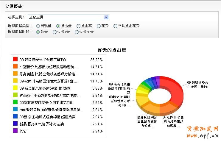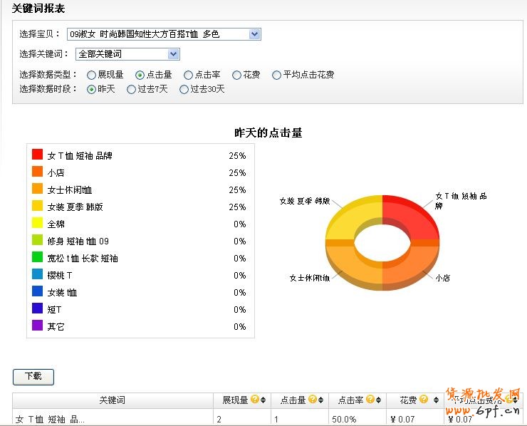 您可以通過餅圖直觀地看到您的推廣寶貝中哪一個點擊量最多,更符合買家喜好,就是您需要重點推廣的寶貝哦!也可以根據下面的表格根據點擊率、點擊量高低進行排序哦!