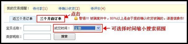 4、您想查找的購買記錄是三個月前的,您沒有選擇“三個月前訂單”選項進行查詢(如圖),“已買到的寶貝”頁面是默認優先顯示“近三個月的訂單”的。您需要點擊“三個月前訂單”進行查看,可選擇成交時間縮小搜索范圍。