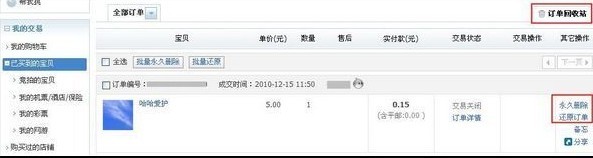 您點擊右上角“訂單回收站”,查看被刪除的訂單,可選擇“還原訂單”或“永久刪除”,淘寶提醒您慎重操作,因為一旦選擇永久刪除,就不能恢復(fù)了哦.