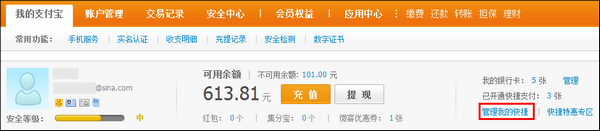 1)之前申請過快捷支付(卡通)的用戶點擊【管理我的快捷】(點此進入操作)——【我的快捷支付】——【添加銀行卡】;