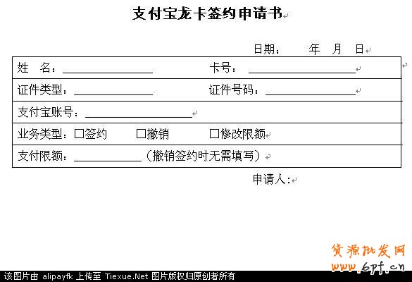 然后,向銀行申請開通支付寶卡通,銀行會給你一份《支付寶龍卡簽約申請書》。設(shè)置你的支付限額,當(dāng)日累計(jì)支付限額不超過2000元。簽約成功后,銀行打印《個人客戶聯(lián)名卡簽約回執(zhí)》。