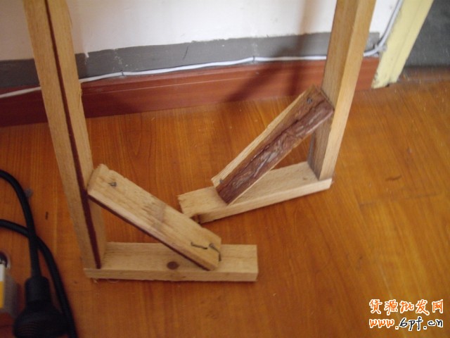 把鋸好的木條取一邊釘成三角形,做成支架的腳,要2個哦(支架的高低按照拍攝的寶貝和場地來定,小a我的是一米長的支架哦)